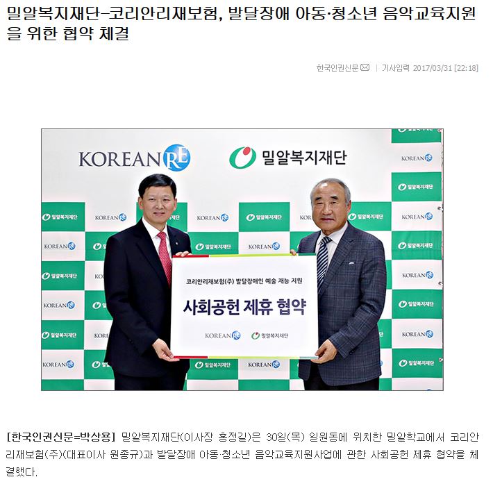 [한국인권신문] 밀알복지재단-코리안리재보험, 발달장애 아동·청소년 음악교육지원을 위한 협약 체결