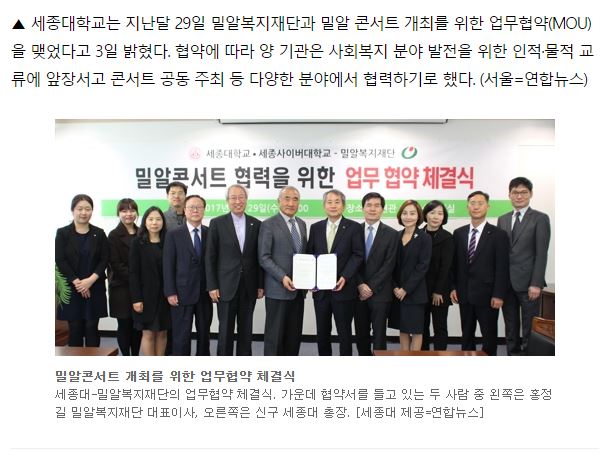[연합뉴스] 세종대, 밀알복지재단과 상호 협력 MOU 체결