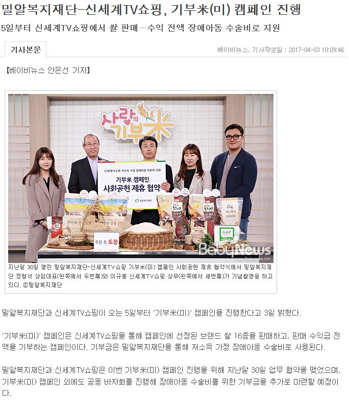 [베이비뉴스] 밀알복지재단-신세계TV쇼핑, 기부米(미) 캠페인 진행