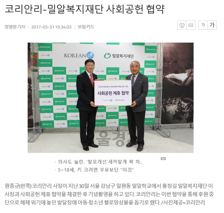 [서울경제] 코리안리-밀알복지재단 사회공헌 협약