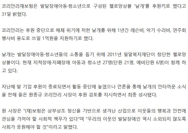 [머니투데이] 코리안리, 발달장애 아동·청소년 후원