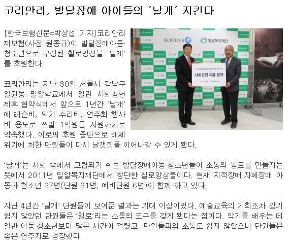 [아시아투데이] 코리안리, 해체 위기놓인 발달장애 첼로앙상블 ‘날개’ 후원키로