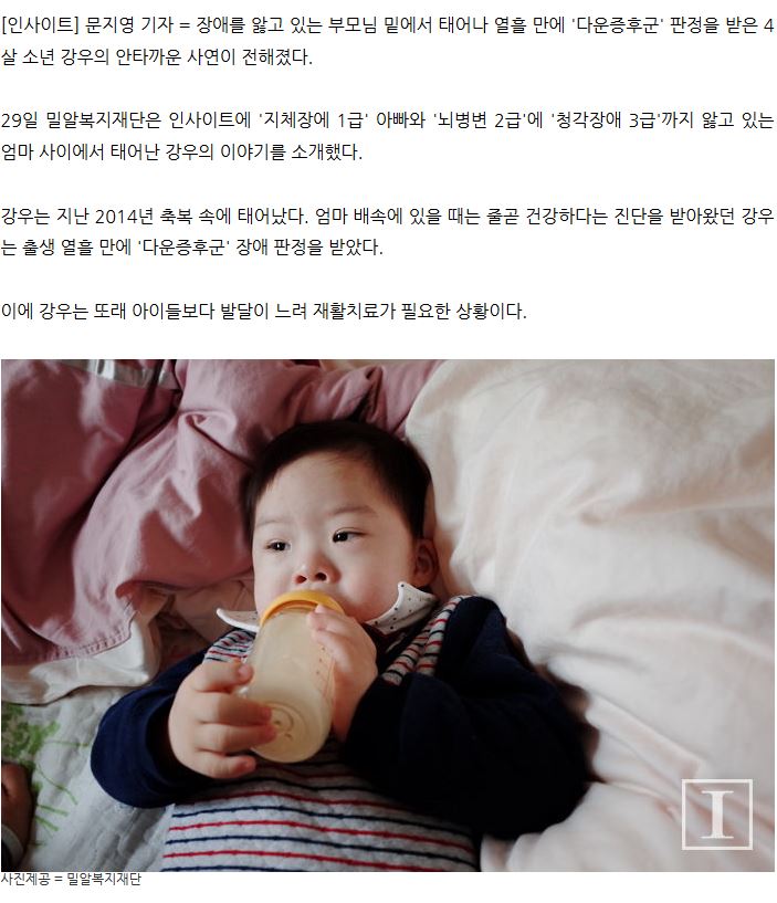 [인사이트] "태어난지 열흘 만에 '다운증후군' 판정받은 4살 강우를 도와주세요"