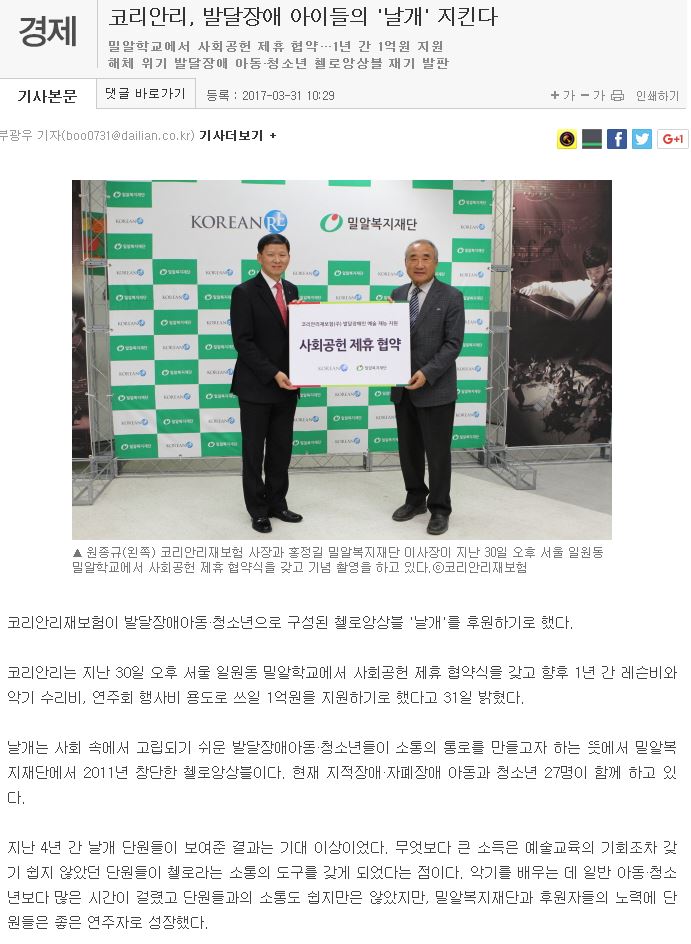 [데일리안e] 코리안리, 발달장애 아이들의 '날개' 지킨다