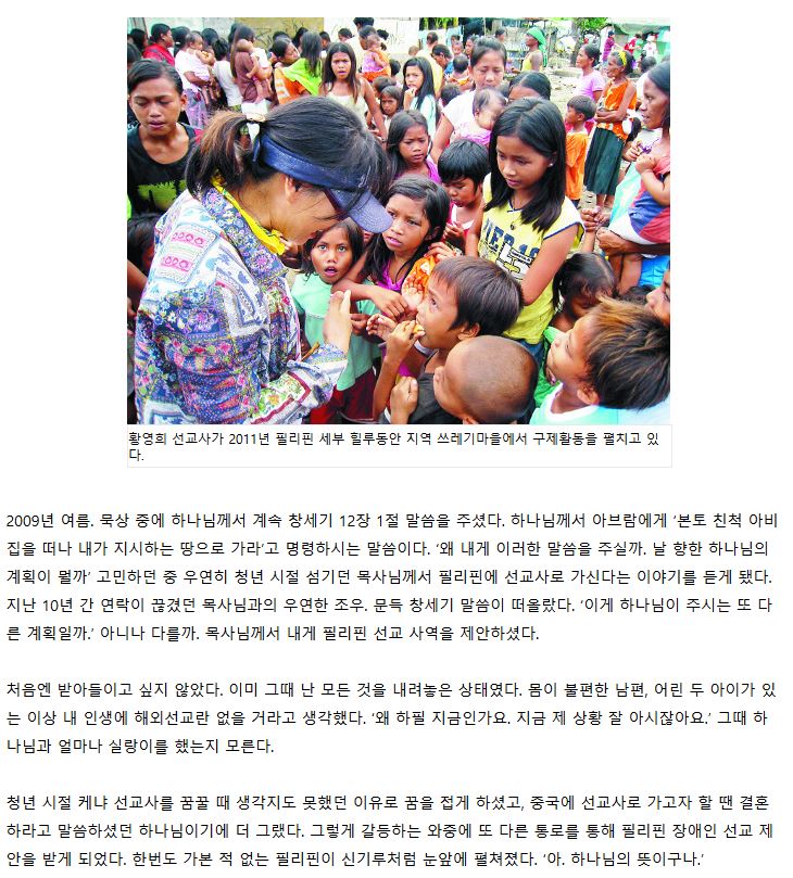 [국민일보] [역경의 열매] 황영희 <6> “필리핀, 왜 하필 지금인가요”… 하나님과 실랑이