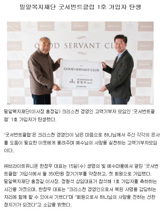 [한국교회공보] 밀알복지재단 굿서번트클럽 1호 한창우 ㈜브라이트유니온 대표