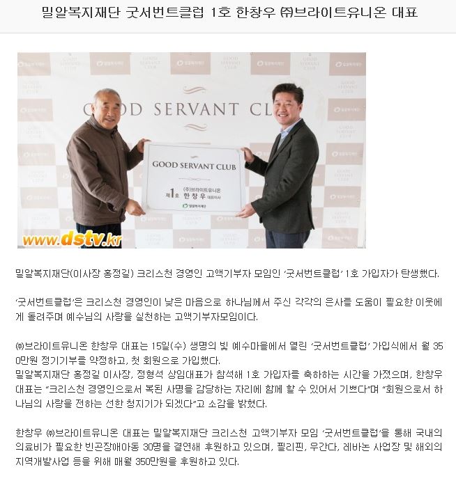 [한국교회공보] 밀알복지재단 굿서번트클럽 1호 한창우 ㈜브라이트유니온 대표