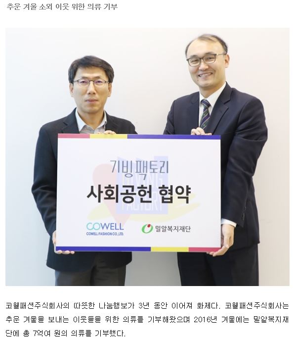 [기독인뉴스] 코웰패션주식회사과 밀알복지대단 소외된 이웃돕기 나서