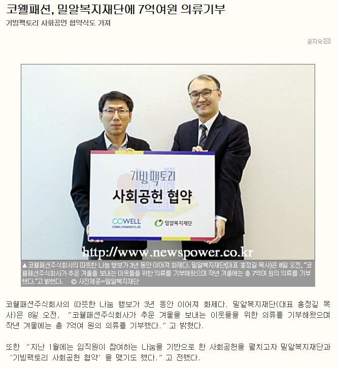 [뉴스파워] 코웰패션, 밀알복지재단에 7억여원 의류기부