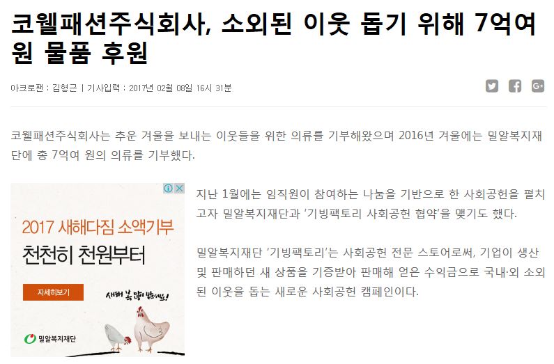 [아크로팬] 코웰패션주식회사, 소외된 이웃 돕기 위해 7억여원 물품 후원
