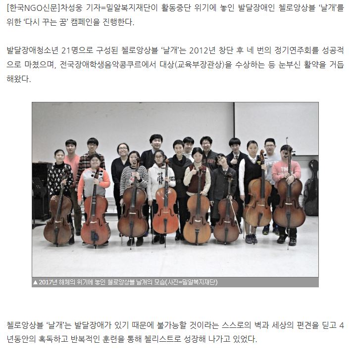[한국ngo신문] 밀알복지재단, 중단위기 놓인 장애인첼로앙상블 위해 '다시 꾸는 꿈’ 캠페인 진행