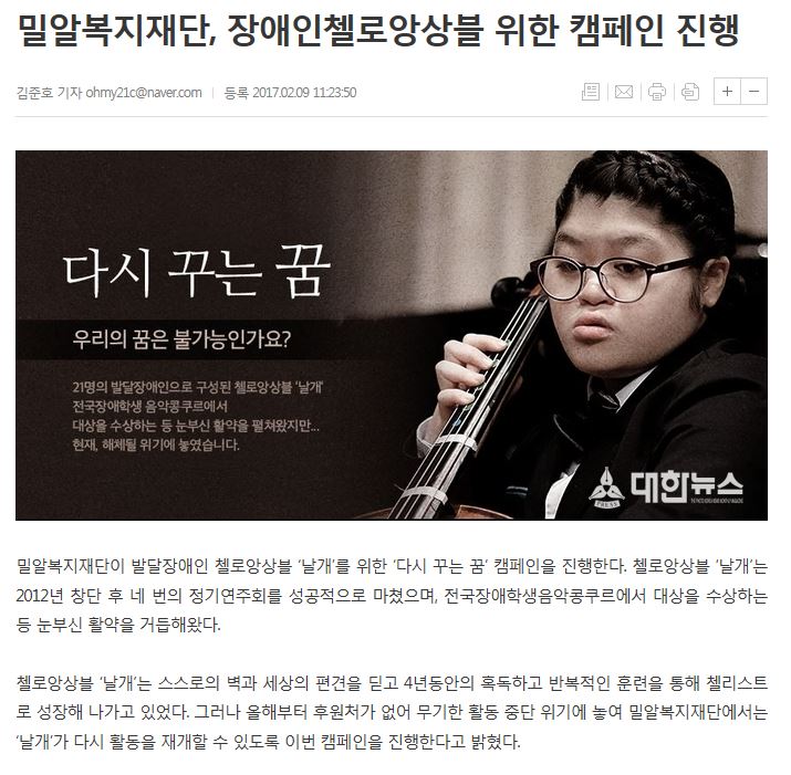 [뉴스타운] 밀알복지재단, 중단위기 놓인 장애인첼로앙상블 ‘다시 꾸는 꿈’ 캠페인