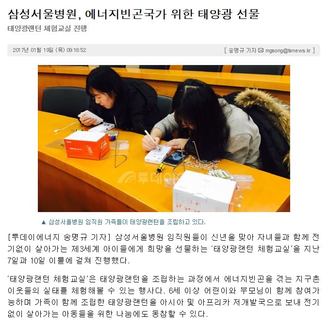 [투데이에너지] 삼성서울병원, 에너지빈곤국가 위한 태양광 선물