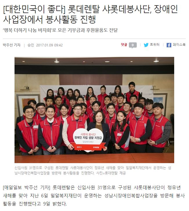 [아시아경제] 롯데렌탈, 임직원 장애인사업장서 봉사활동…기부금도 전달