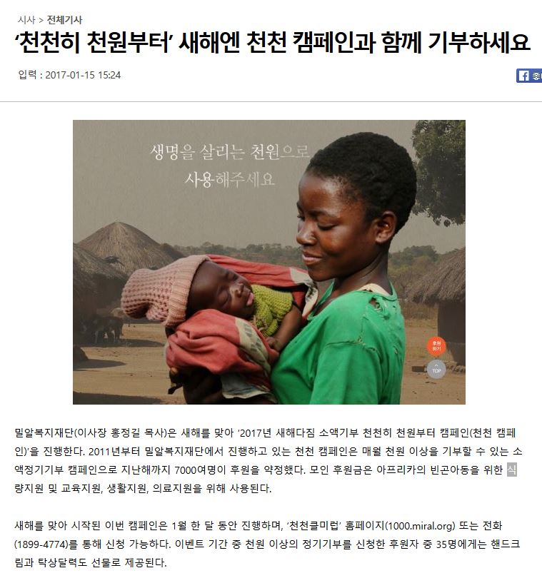 [국민일보] ‘천천히 천원부터’ 새해엔 천천 캠페인과 함께 기부하세요