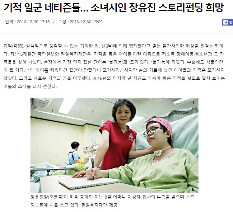 [국민일보] 기적 일군 네티즌들… 소녀시인 장유진 스토리펀딩 희망