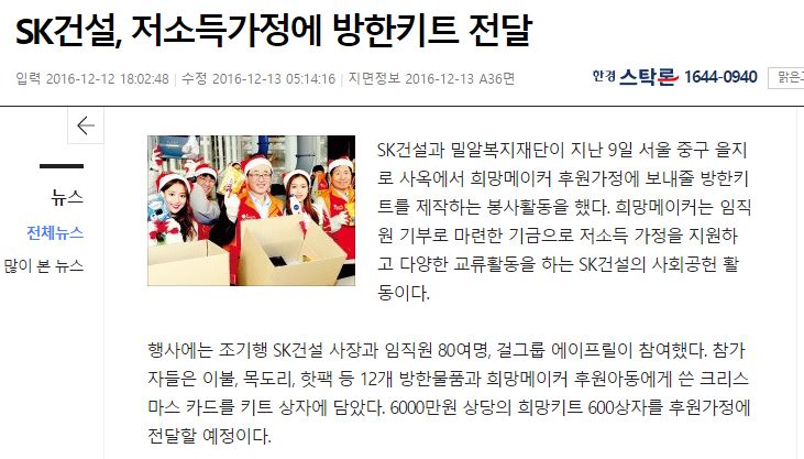 [한국경제] SK건설·밀알복지재단, 저소득가정에 방한키트 전달
