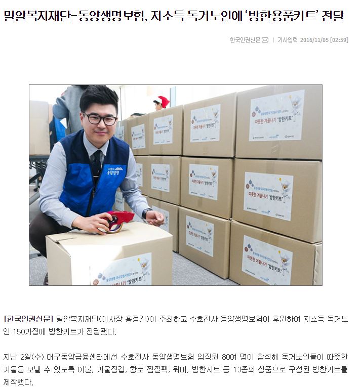 [복지연합신문] 동양생명보험-밀알복지재단, ‘방한용품키트’ 저소득 독거노인에게 전달