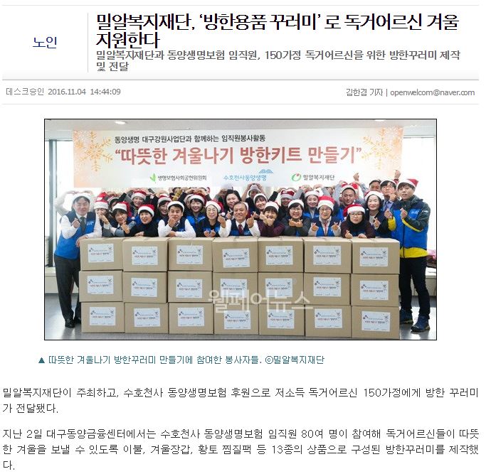 [한국인권신문] 밀알복지재단-동양생명보험, 저소득 독거노인에 ‘방한용품키트’ 전달