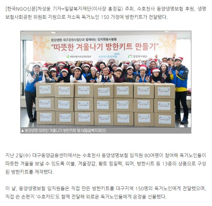 [한국NGO신문] 수호천사 동양생명보험-밀알복지재단, ‘방한용품키트’ 저소득 독거노인에게 전달