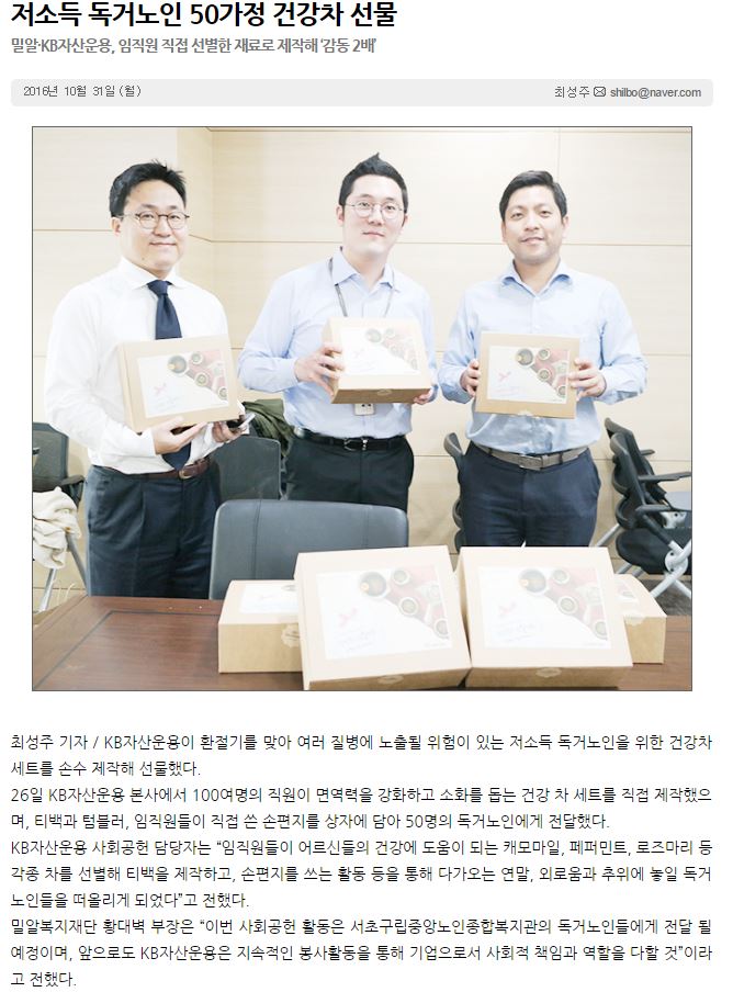 [한국인권신문] 밀알복지재단-KB자산운용, 임직원 손수 만든 건강차 독거노인들에게 전달