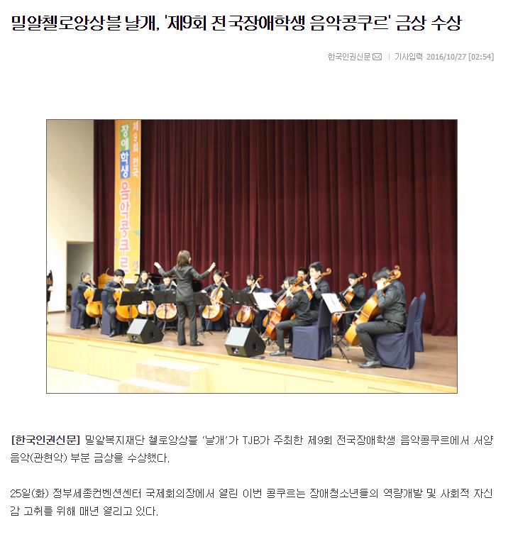 [한국인권신문] 밀알첼로앙상블 날개, '제9회 전국장애학생 음악콩쿠르' 금상 수상