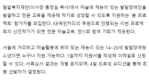 [보도기사] 발달장애인 창작지원 그룹홈 ‘샘물밀알의집’ 입주작가 모집