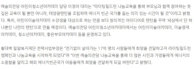 [일요신문] 밀알복지재단과 예술의전당이 함께하는 태양광랜턴 체험교실 진행