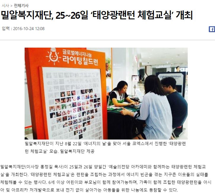 [국민일보] 밀알복지재단, 25~26일 ‘태양광랜턴 체험교실’ 개최