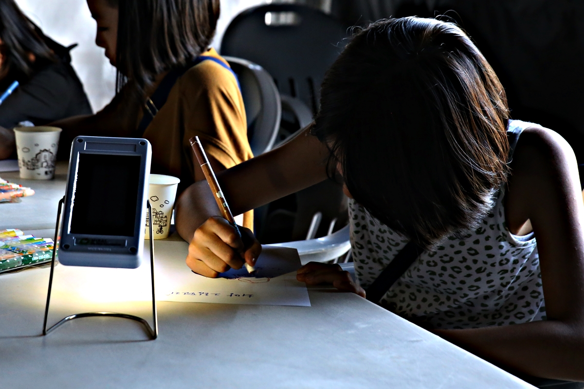 블랙아웃 체험관에서 태양광 랜턴의 빛으로 희망 편지 쓰는 어린이