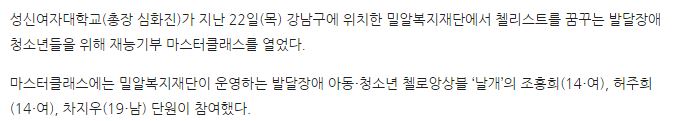 [아크로팬] 성신여대, 발달장애 첼리스트 꿈나무 위해 재능기부 마스터클래스 열어