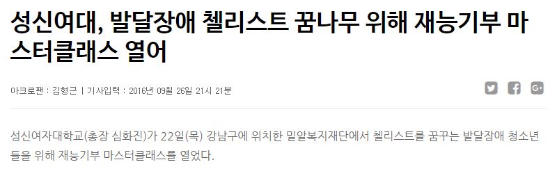 [헤럴드경제] 성신여대 체인지(體人知) 사회봉사단, 발달장애 첼리스트 꿈나무 위해 재능기부