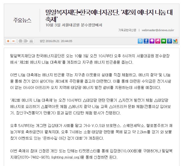 [기독교한국신문] 밀알복지재단-한국에너지공단, ‘제2회 에너지 나눔 대축제’