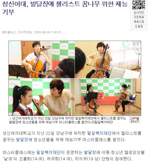 [에이블뉴스] 성신여대, 발달장애 첼리스트 꿈나무 위한 재능기부