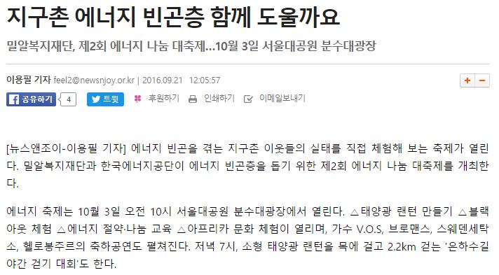이전 [시사타임즈] 밀알복지재단, 제2회 에너지 나눔 대축제 개최 다음 [우먼컨슈머] 지구촌 에너지 빈곤층 돕는 축제 열린다