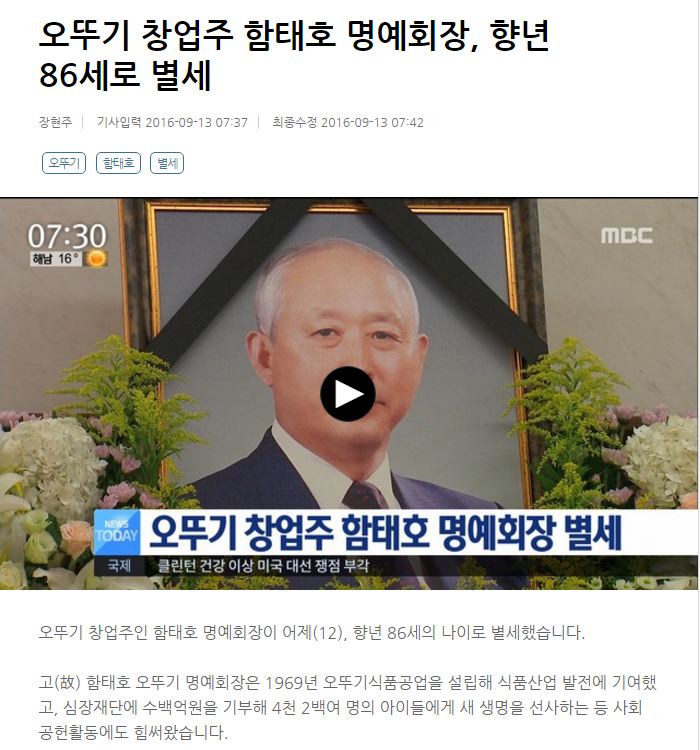 [MBC] 오뚜기 창업주 함태호 명예회장, 향년 86세로 별세