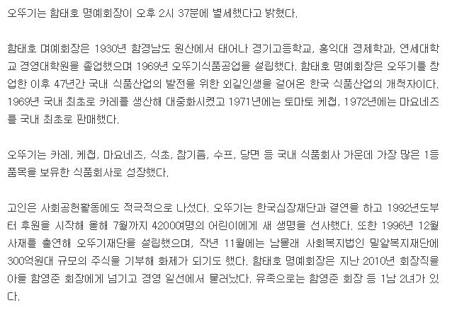 [국제신문] 함태호 오뚜기 명예회장 별세...카레.케첩 등 대중화 식품산업 개척자