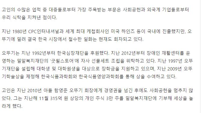 [스페셜경제] 오뚜기 창업 함태호 명예회장 별세… "선행 베풀던 인물"