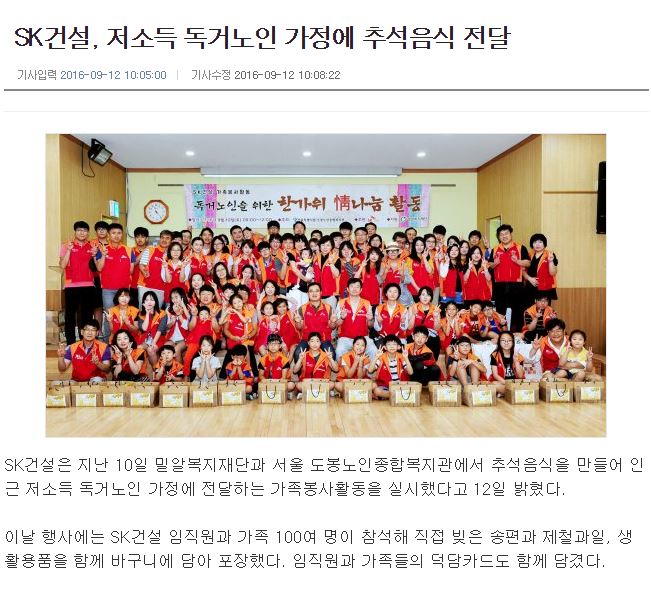 [동아일보] SK건설, 저소득 독거노인 가정에 추석음식 전달