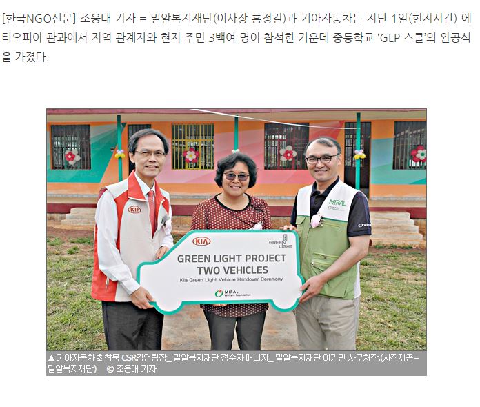 [보도기사] 밀알복지재단-기아자동차, 에티오피아에서 중등학교 완공식 진행