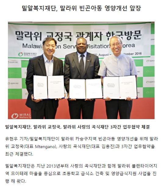 [크리스천데일리] 밀알복지재단, 말라위 빈곤아동 영양개선 앞장