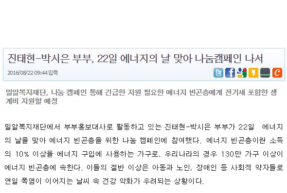 [보도기사] 진태현-박시은 부부, 22일 에너지의 날 맞아 나눔캠페인 나서