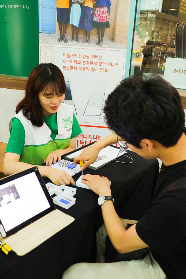 ‘태양광랜턴 체험교실’은 태양광랜턴을 조립하는 과정에서 에너지 빈곤을 겪는 지구촌 이웃들의 실태를 체험해볼 수 있는 행사다. 조립체험장에 방문한 시민들은 누구나 무료로 태양광랜턴을 조립해 볼 수 있으며, 직접 조립한 태양광랜턴을 아시아 및 아프리카의 저개발국으로 보내 전기 없이 살아가는 지구촌 이웃들을 위한 나눔에도 동참할 수 있다.