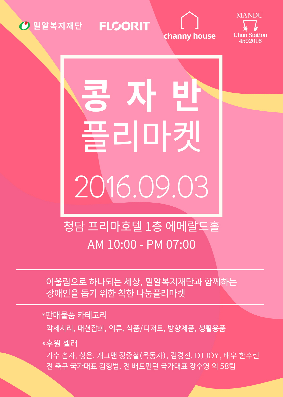 콩자반 플리마켓에서는 의류, 패션잡화, 생활용품 등 58개 셀러들의 다양한 상품들이 선보인다. 특히 개그맨 정종철과 김경진, 가수 겸 DJ 춘자, 가수 성은, 배우 한수린, 전 축구 국가대표 김형범, 전 배드민턴 국가대표 장수영 등의 스타들도 셀러로 참여해 물품 판매와 더불어 자신의 애장품을 판매하는 이벤트도 진행할 예정이다.