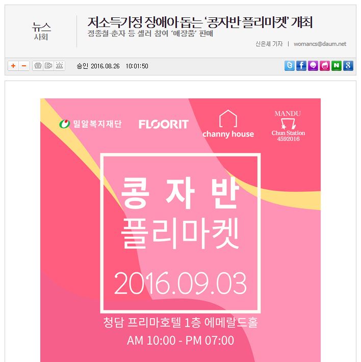 이전 [한국NGO신문] 저소득가정 장애아동 돕는 ‘콩자반 플리마켓’ 개최 다음 [스포츠경향] 밀알복지재단 장애아동 돕기 위한 나눔플리마켓, 3일 개최…춘자, 성은, 정종철, 김경진 등 동참