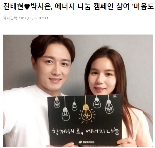 [엑스포츠뉴스] 진태현♥박시은, 에너지 나눔 캠페인 참여 '마음도 예쁜 부부'