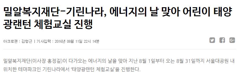 [아크로팬] 밀알복지재단-기린나라, 에너지의 날 맞아 어린이 태양광랜턴 체험교실 진행
