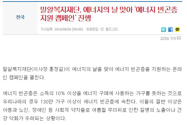 [월드스타] 밀알복지재단, 에너지의 날 맞아 '에너지 빈곤층 지원 캠페인' 진행