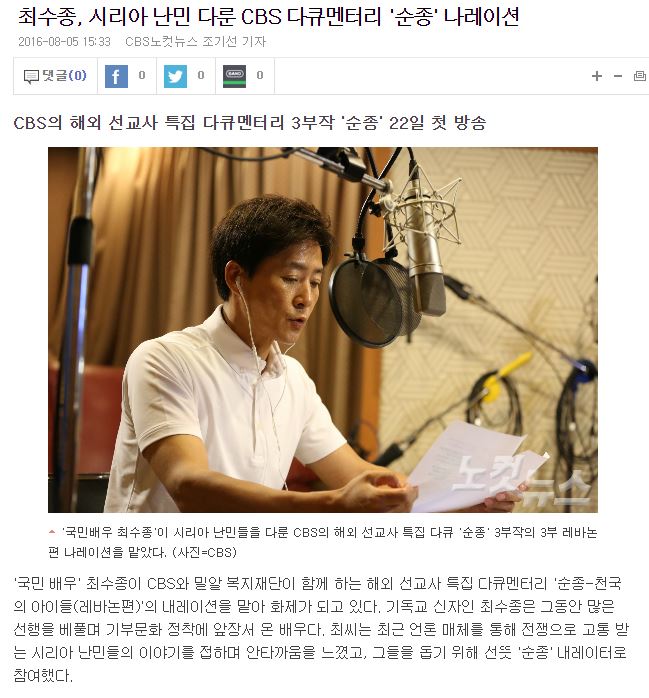 [노컷뉴스] 최수종, 시리아 난민 다룬 CBS 다큐멘터리 '순종' 나레이션
