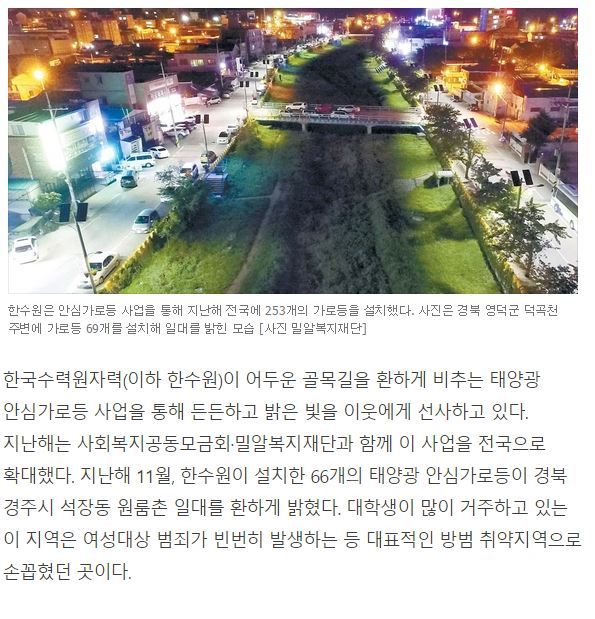 [중앙일보] [NPO가 희망이다] 한수원과 태양광 안심가로등 설치…한밤 귀갓길 걱정 덜어